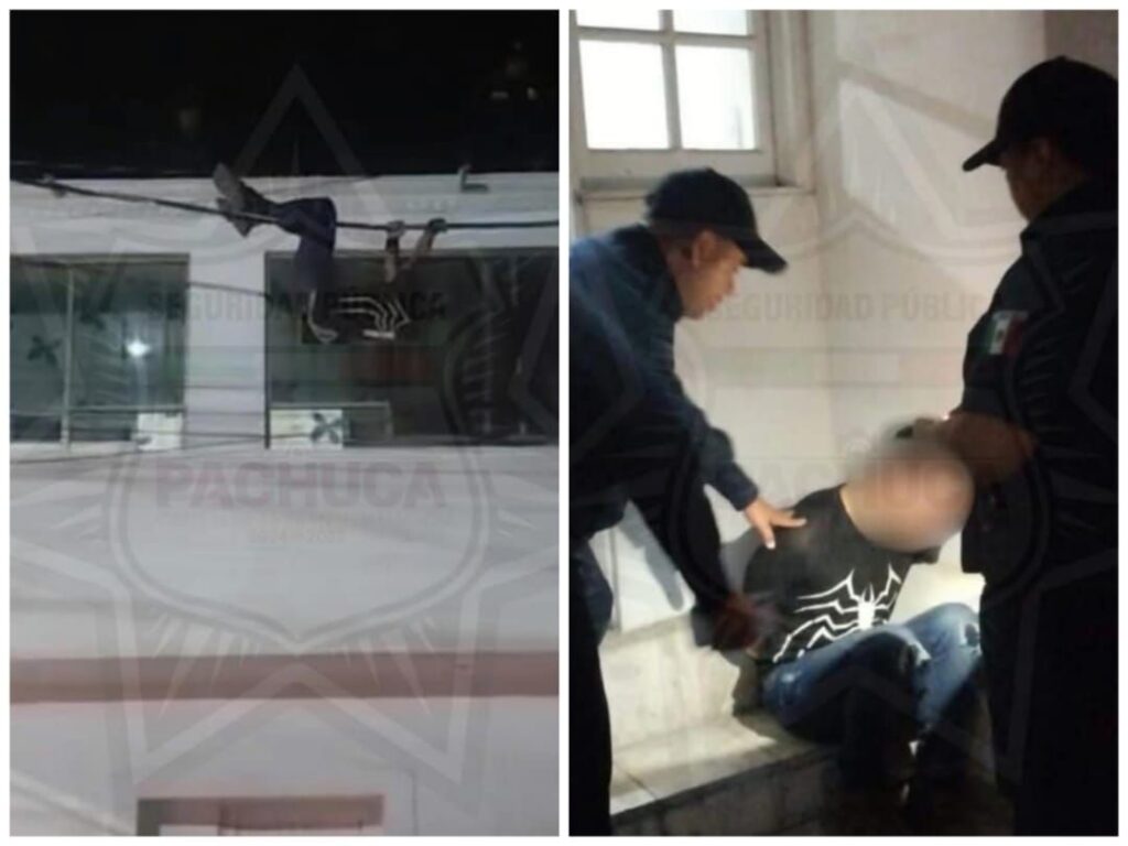 Un sujeto que presuntamente intentaba atentar contra su vida aventandose desde lo alto de cables de teléfono fue rescatado a tiempo por elementos de la policía municipal de Pachuca.